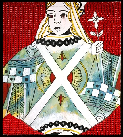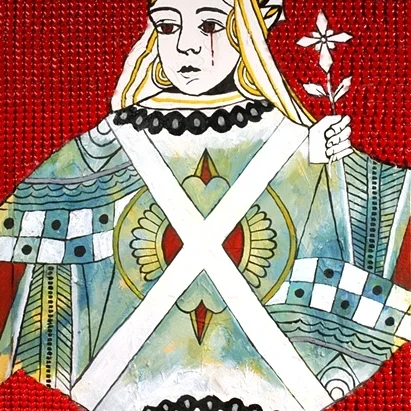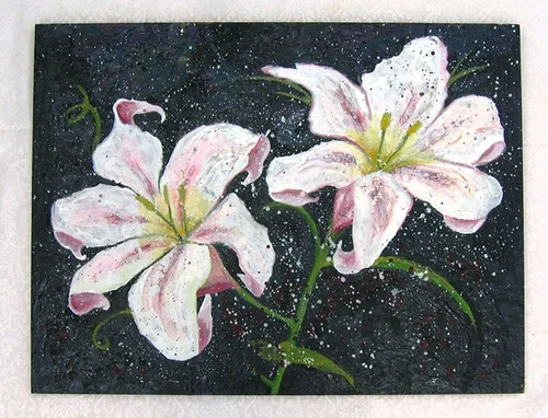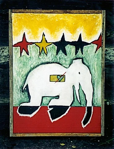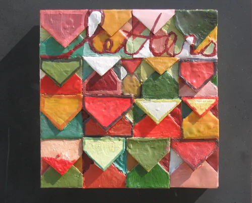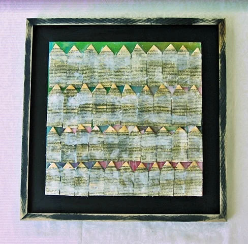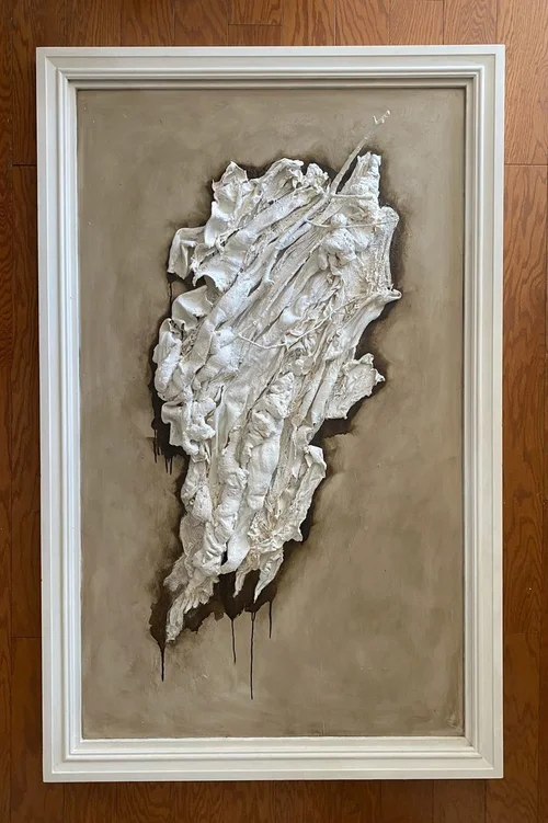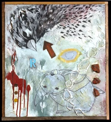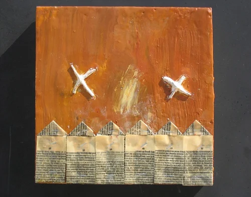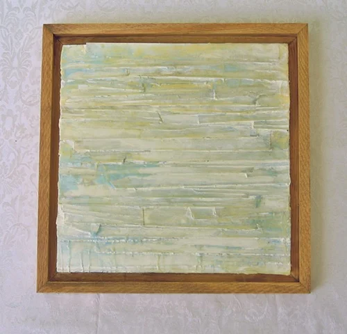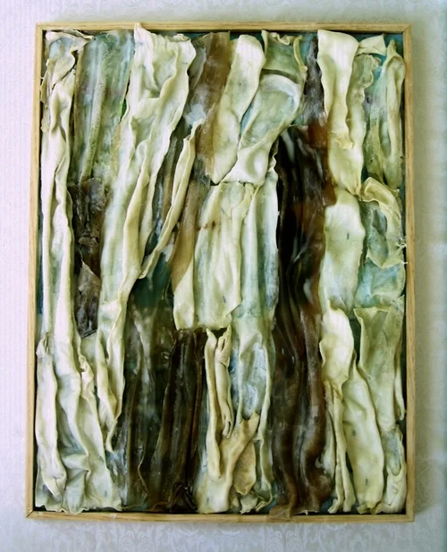 Sculptural encaustic paintings using rawhide, wax, paper, and wood.